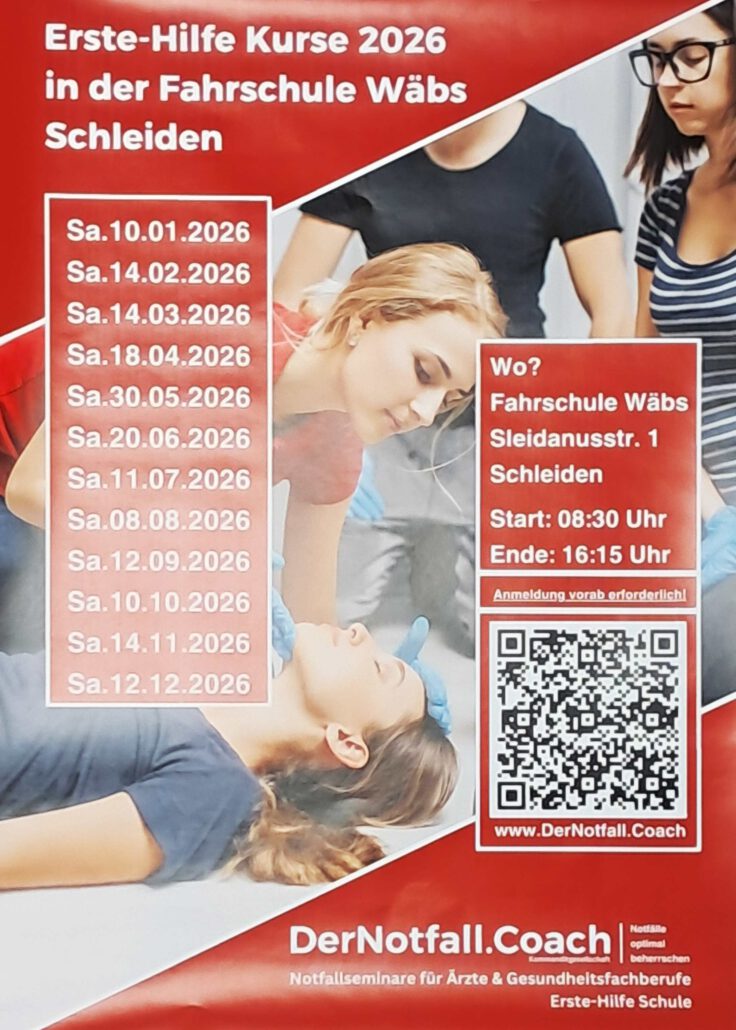 Erste Hilfe-Kurse können bei uns absolviert werden. Dafür stehen wir in Kooperation mit der Firma DerNotfall.Coach, die vor Ort in unserer Fahrschule die Erste-Hilfe-Ausbildung monatlich durchführt.